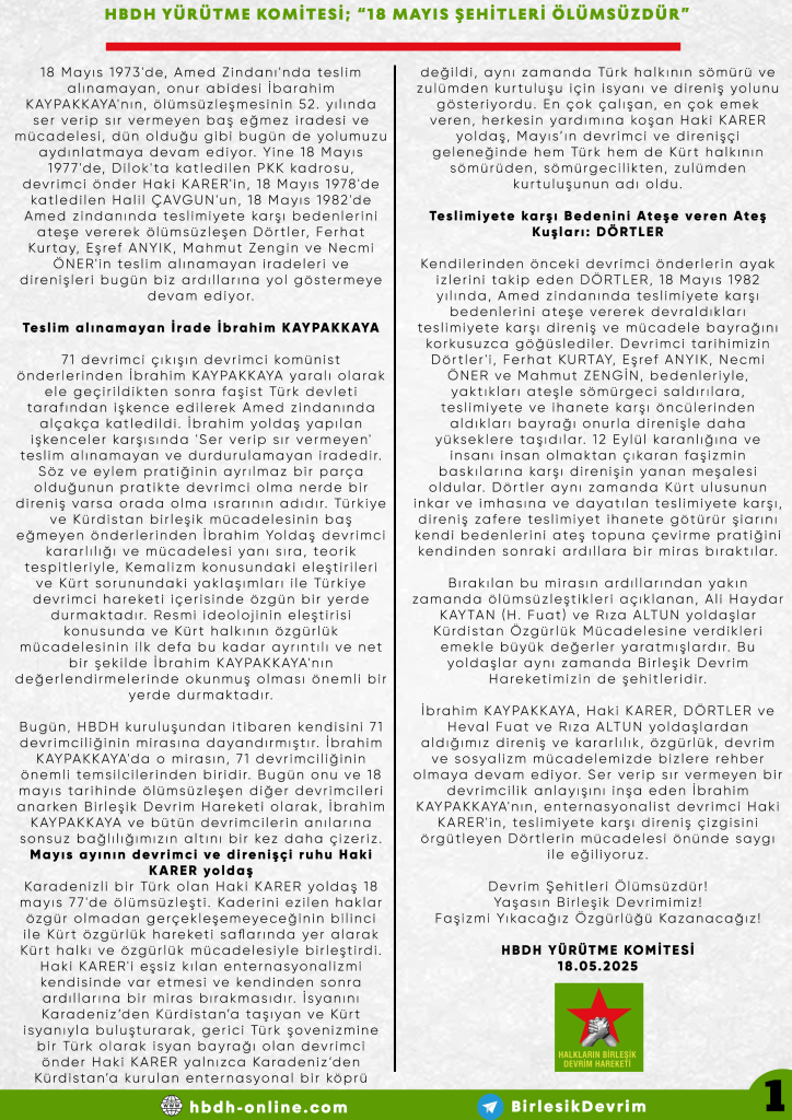 18 Mayıs 1973’de, Amed Zindanı’nda teslim alınamayan, onur abidesi İbarahim KAYPAKKAYA’nın, ölümsüzleşmesinin 52. yılında ser verip sır vermeyen baş eğmez iradesi ve mücadelesi, dün olduğu gibi bugün de yolumuzu aydınlatmaya devam ediyor. Yine 18 Mayıs 1977’de, Dilok’ta katledilen PKK kadrosu, devrimci önder Haki KARER’in, 18 Mayıs 1978’de katledilen Halil ÇAVGUN’un, 18 Mayıs 1982’de Amed zindanında teslimiyete karşı bedenlerini ateşe vererek ölümsüzleşen Dörtler, Ferhat Kurtay, Eşref ANYIK, Mahmut Zengin ve Necmi ÖNER’in teslim alınamayan iradeleri ve direnişleri bugün biz ardıllarına yol göstermeye devam ediyor.